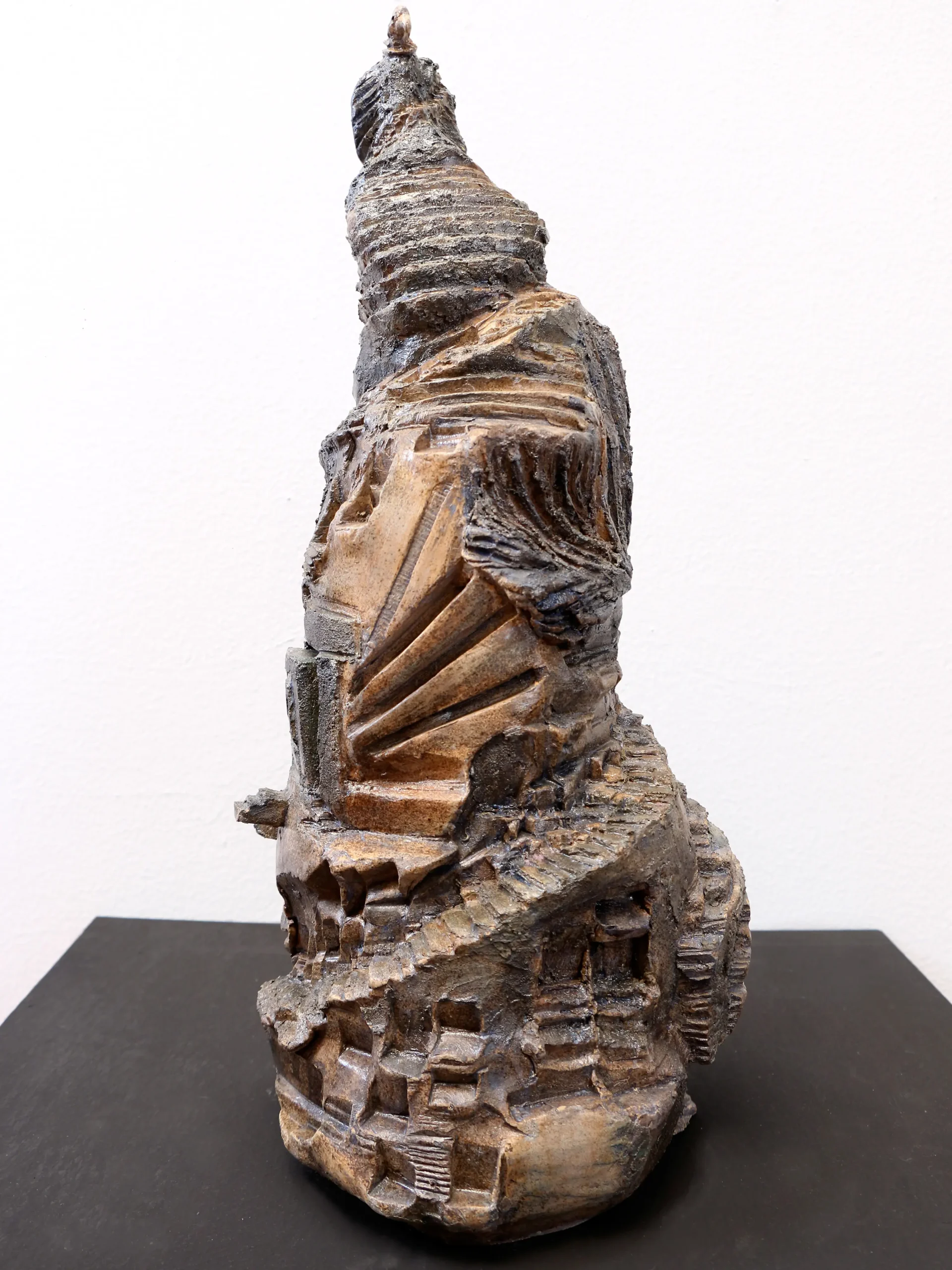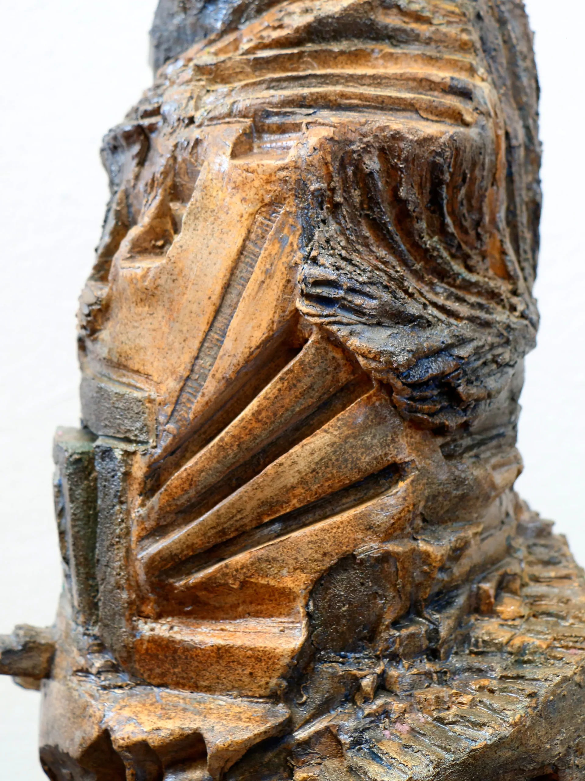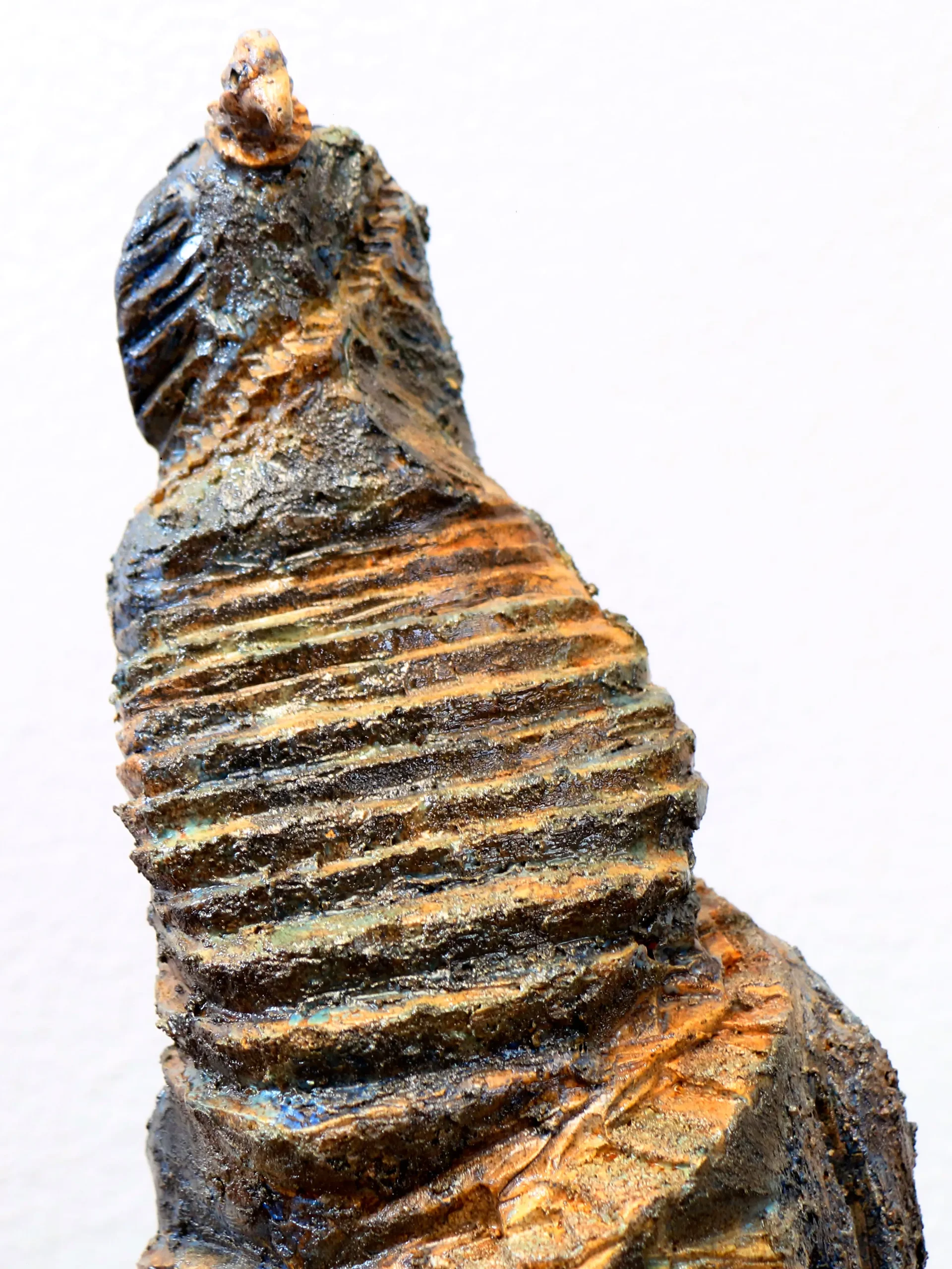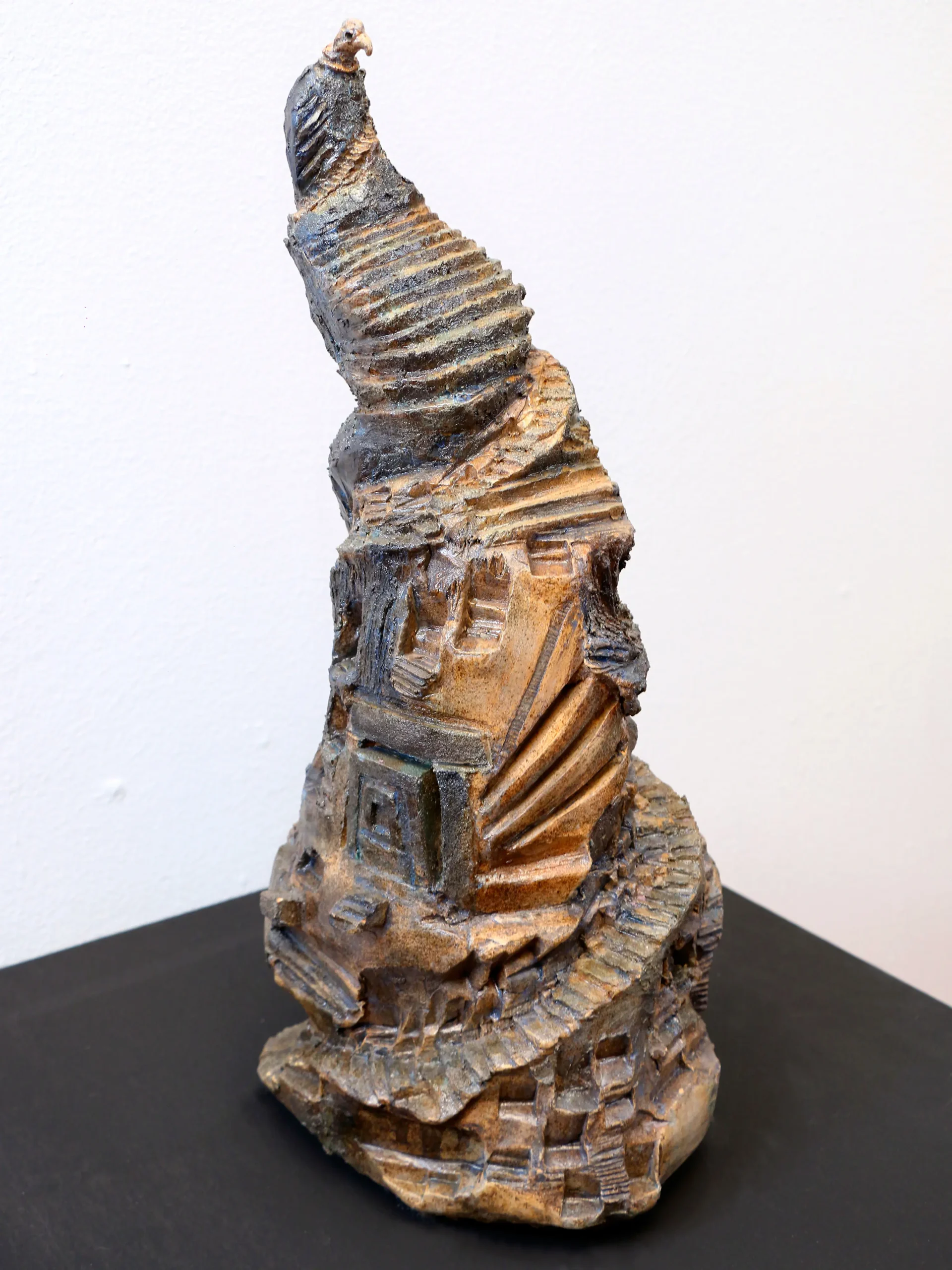 En loza vidriada, la obra encierra el espíritu andino que observa, resiste y vuela alto, aun en la caída. Es canto final y testimonio de una grandeza que se niega a extinguirse.