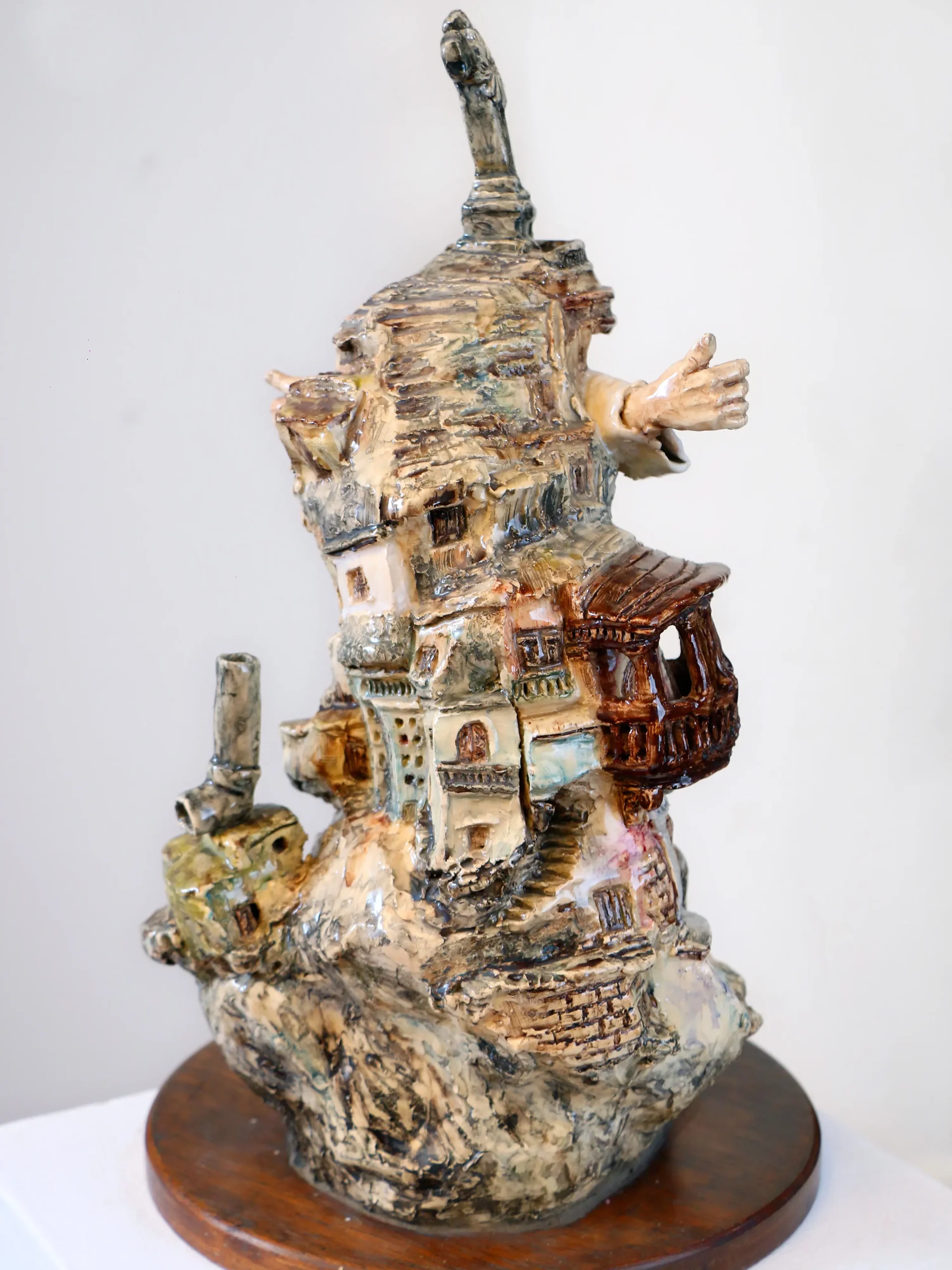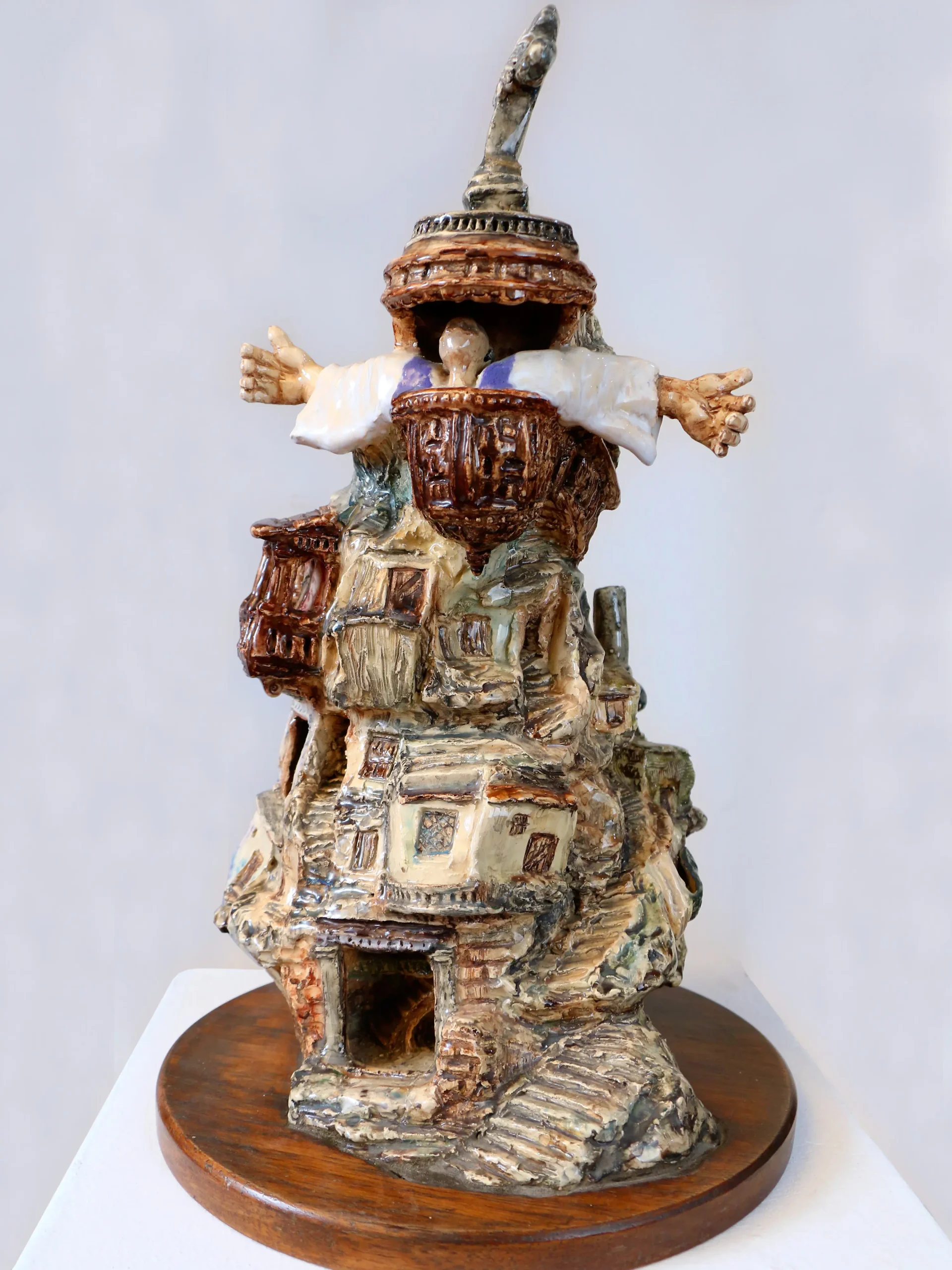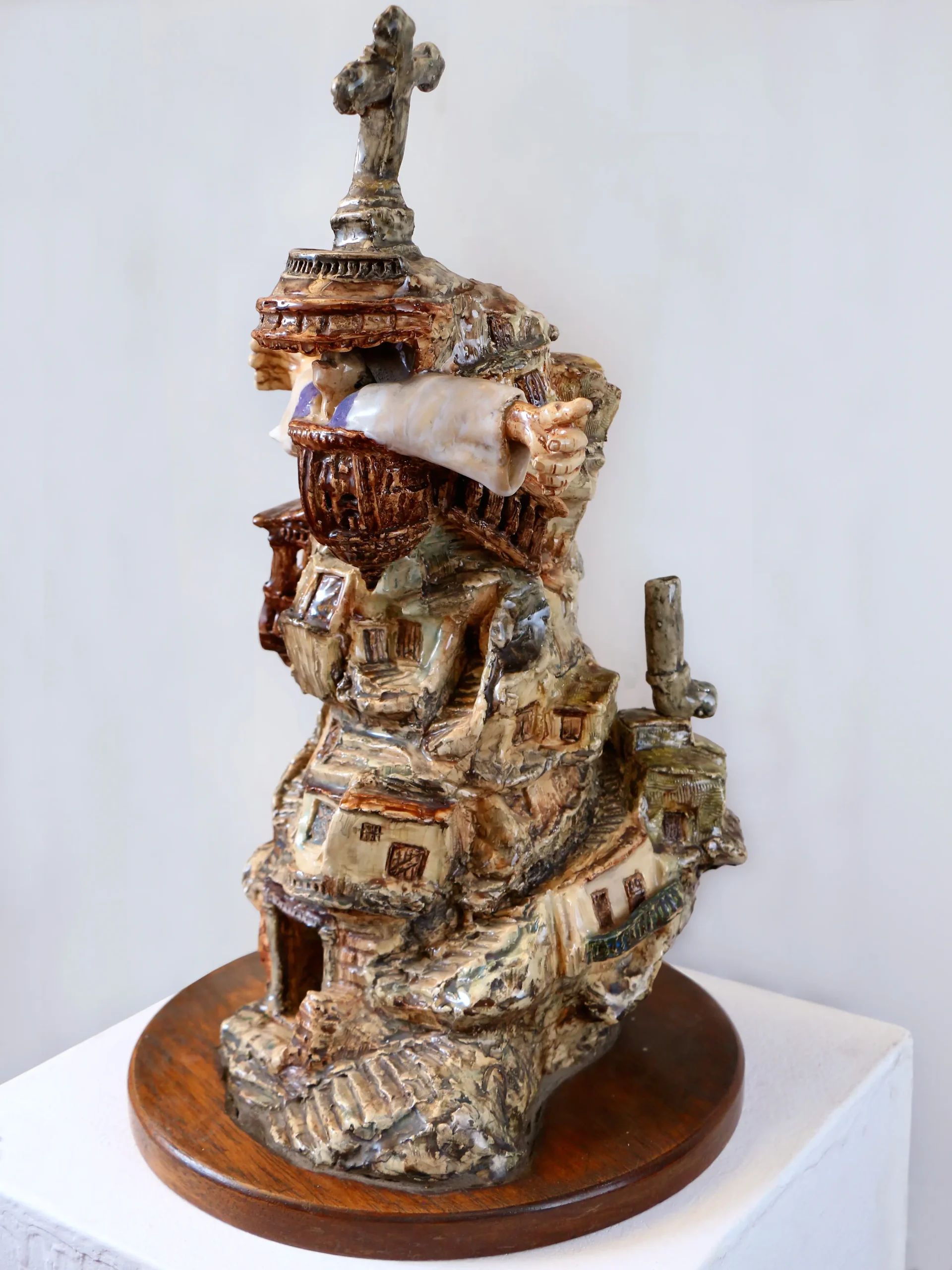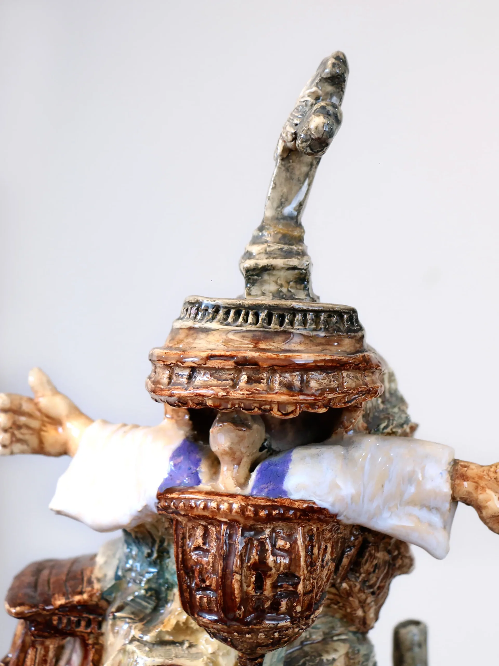 La loza vidriada subraya el carácter teatral y simbólico de esta escena, que rinde homenaje al habla como forma de poder y memoria.