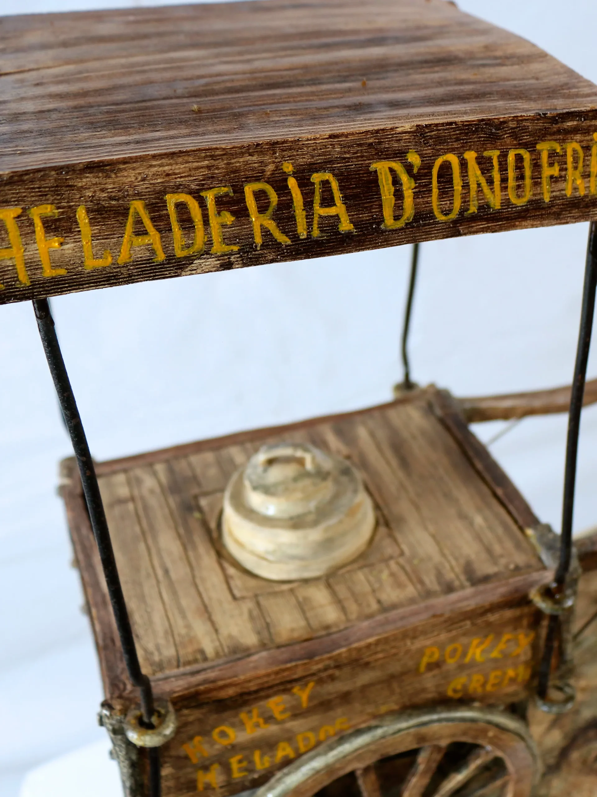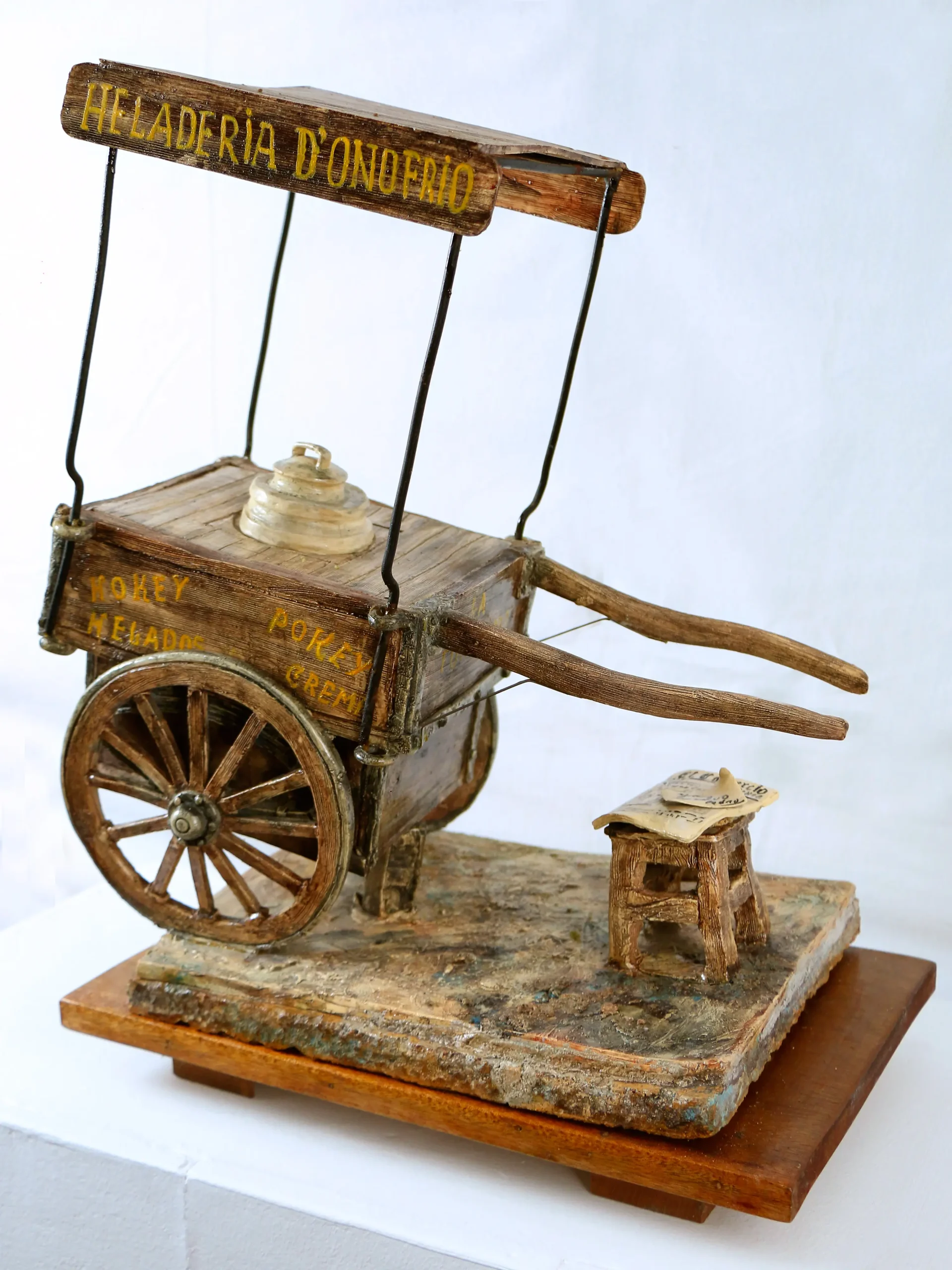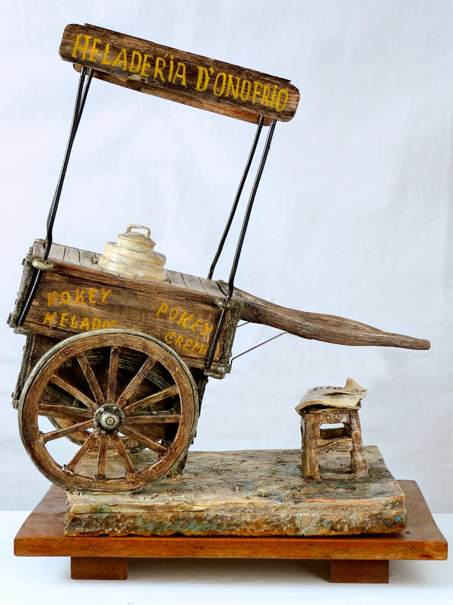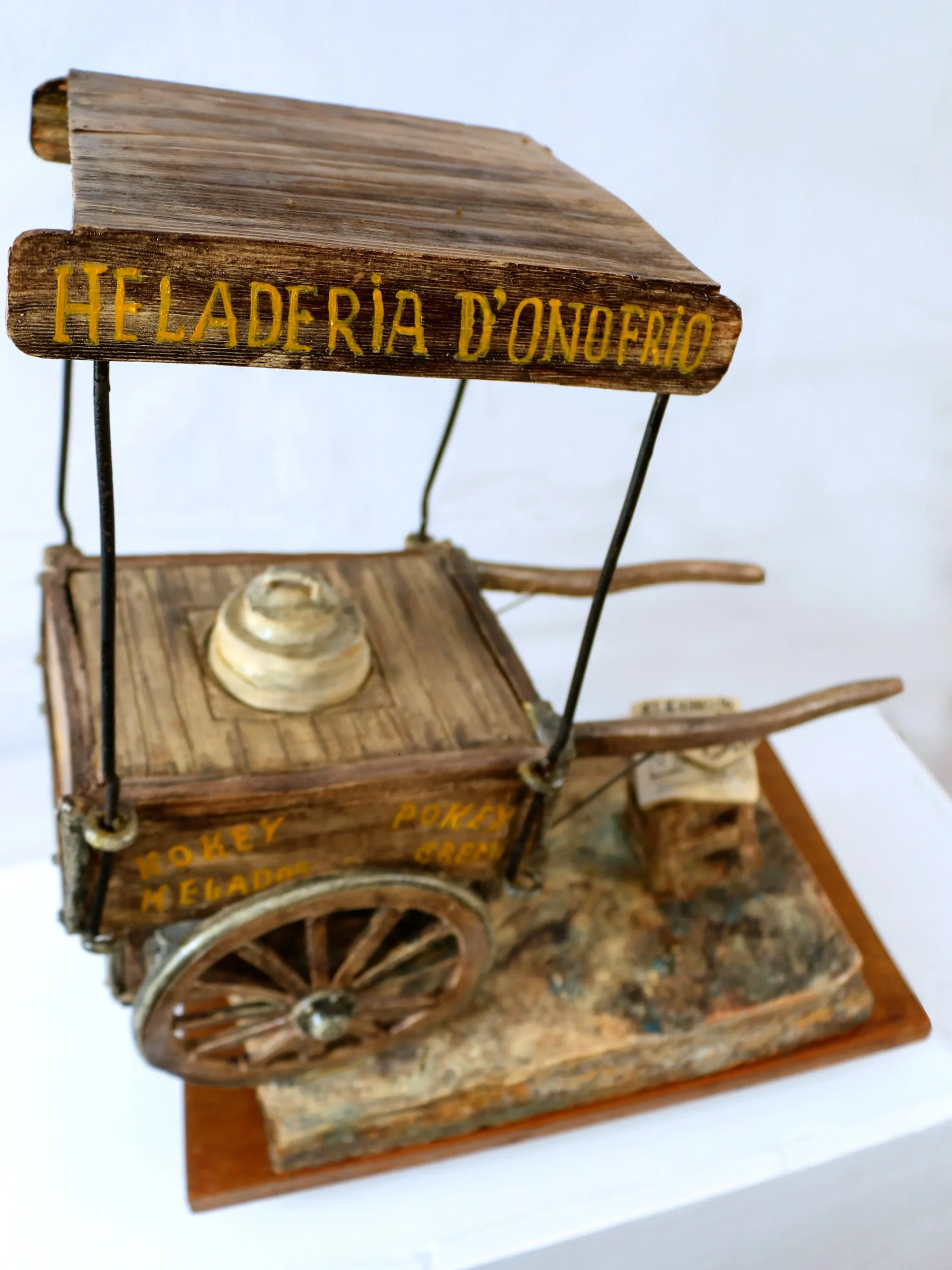 «Ya vuelvo. Pedro D’Onofrio» evoca una pausa en la rutina del vendedor de helados, figura entrañable del paisaje urbano limeño. La carretilla, el banco vacío, el periódico y el mensaje manuscrito construyen una escena de nostalgia y ausencia.